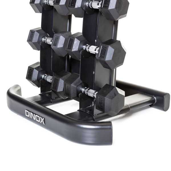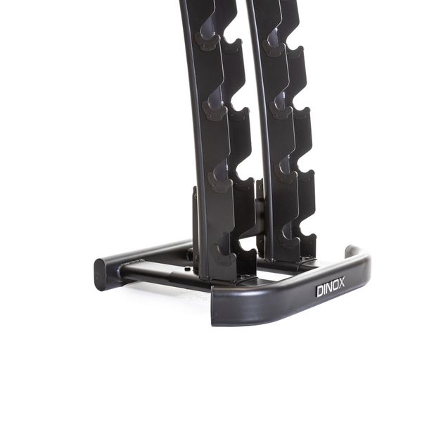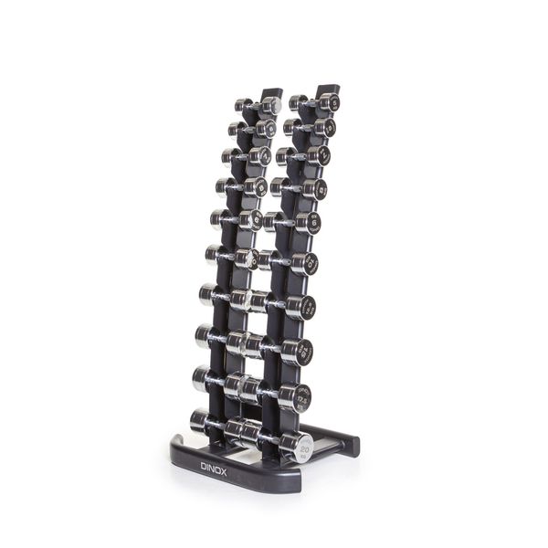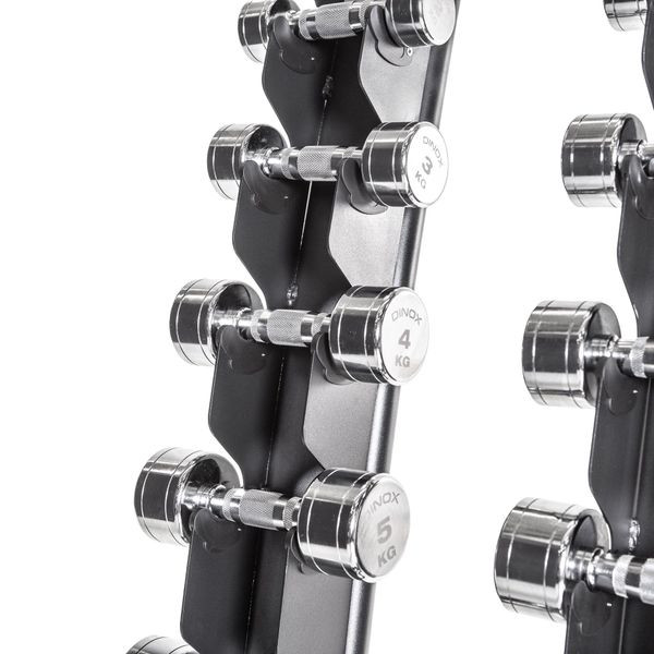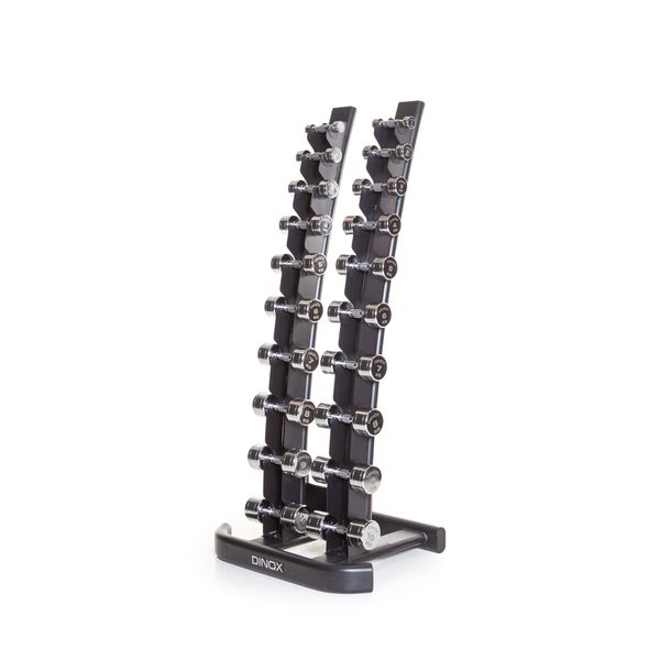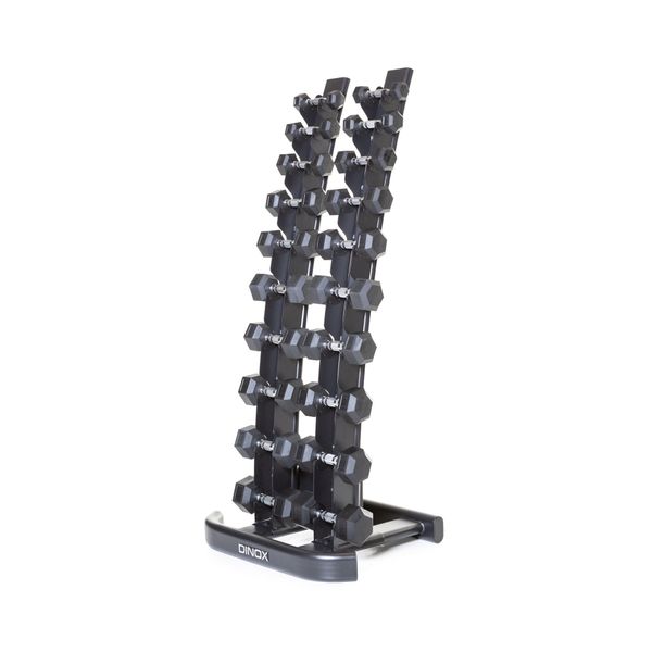 Snyggt och robust vertikalt hantelställ med plats för 10 par hantlar. Stativets böjda design gör det enkelt att ta bort och byta ut hantlarna. Mått och dimensioner. Vikt 37,5 kg.