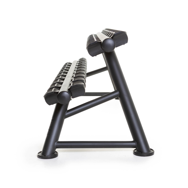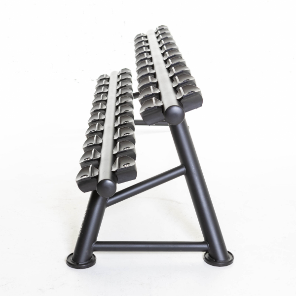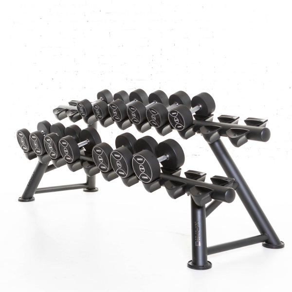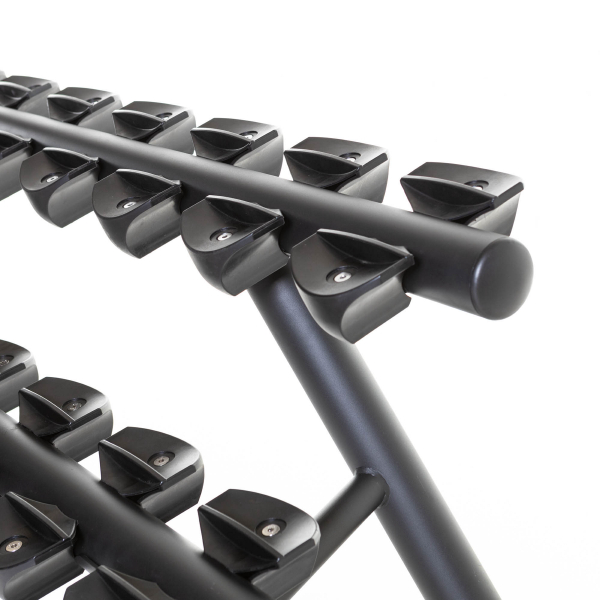 Detta ställ tål riktigt hårda belastningar. Hantelställets böjda ställdelar möjliggör säker förvaring av den runda hanteln. Utformningen av ställets ram tar hänsyn till den potentiella obalans som orsakas av höga viktbelastningar och detta ställ förblir stabilt även när belastningen är ojämnt fördelad på stället.
