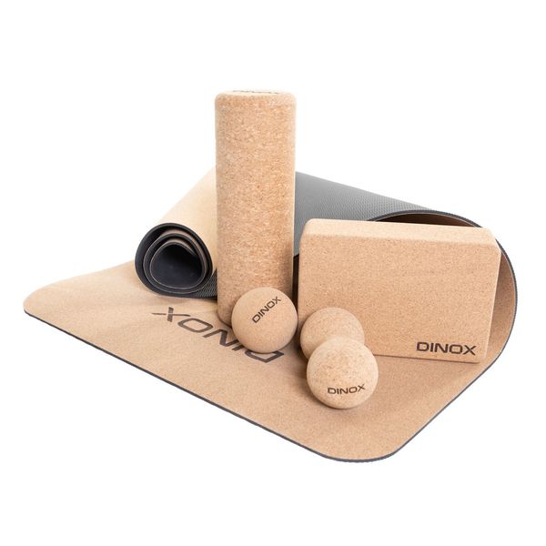 Massagerullen är en del av Dinox miljövänliga och vackra professionella yogaset, som är tillverkat av återvunnen kork. I setet ingår: